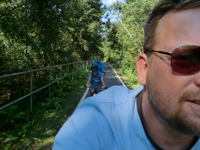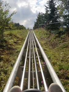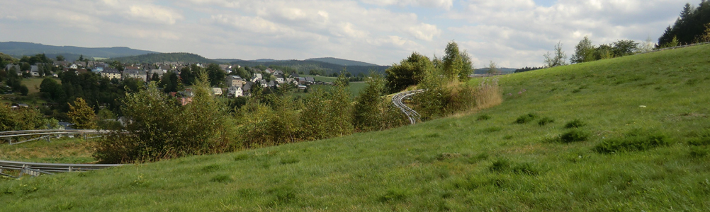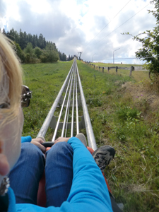 Uns blieb ein Blick direkt zur Mauer auch verwehrt. Leider haben immer wieder irgendwelche Wälder und Zäune im Weg gestanden. Dann sind wir auf das Rad gestiegen und nach Eibenstock geradelt. Dort gibt es die Wurzelrudis Erlebniswelt. Hier gibt es eine Sommerrodelbahn und manches mehr. Das ist natürlich für Tim etwas gewesen. Aber auch für uns. Also Tim zu erst und dann wir :-))