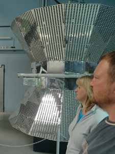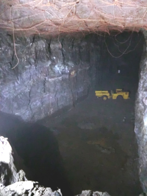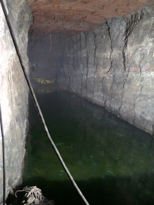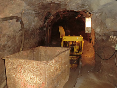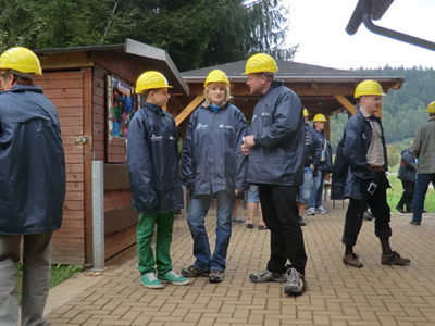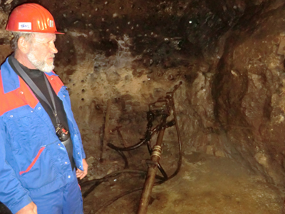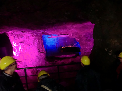Der Bergmann, hier in Rot, hat uns dann alle möglichen Bohrgeräte und Verfahren genau erklärt. So erhält man schon einen kleinen Überblick wie schwer die Arbeit eines Bergmann gewesen ist. Und dann ging es zu den größten Zinnkammern Europas. 45 Meter lang, 12 Meter hoch und 10 Meter breit sind die Ausmaße dieser riesigen Löcher die hier aus dem Felsen gesprengt worden sind. Und das ganze drei mal. Diese Fahrzeuge die da stehen sind große Gruben LKW. So nenne ich diese mal. Durch die Größe der Holräume hat man da unten einen richtig guten Klang wenn man dort Musik hört. Und deshalb haben die drei Zinnen auch eine Bühne. Und dort werden auch Veranstaltungen abgehalten.